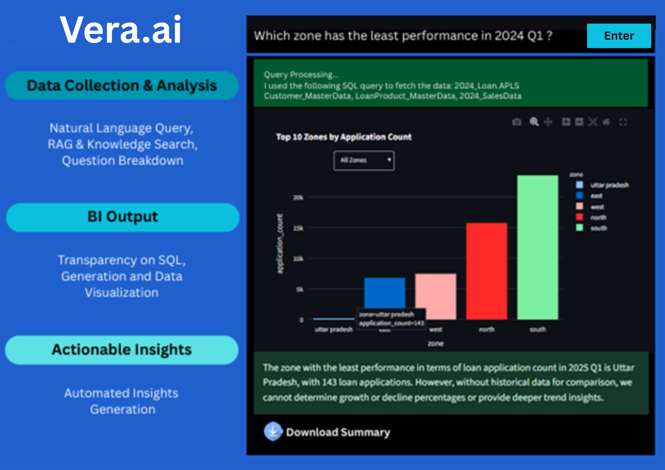 With our Gen BI solution, users can ask questions in plain English and get instant answers. The system translates queries into SQL automatically, eliminating the need for coding